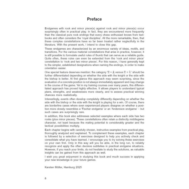 Końcówki, w których po obu stronach pozostaje wieża i figura lekka, zdarzają się w praktyce zaskakująco często – nawet częściej niż klasyczne, czyste końcówki wieżowe, które od dawna uznawane są za „królewską dyscyplinę” teorii. Mimo to, literatura szachowa poświęcała dotychczas niewiele uwagi tym złożonym i wielowymiarowym pozycjom. Niniejsza książka stawia sobie za cel wypełnienie tej luki i zbadanie obszaru o ogromnym znaczeniu praktycznym dla ambitnych szachistów.