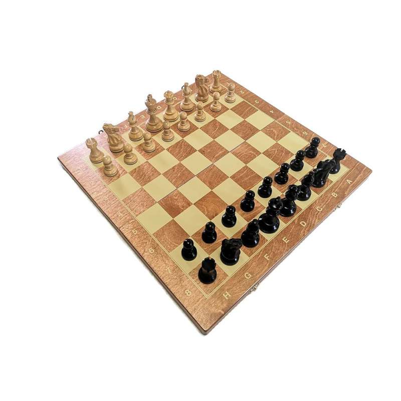 Zestaw składa się ze składanej szachownicy w turniejowym rozmiarze nr. 5 w kolorze mahoń: