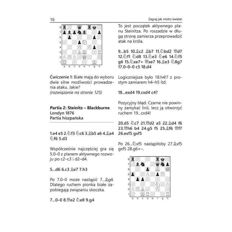 Niezwykle istotne jest zapoznanie się z dorobkiem twórczym mistrzów świata. Czego można się nauczyć od nich? Z całą pewnością bardzo wiele. Każdy z nich był bowiem najwybitniejszym graczem swoich czasów i na drodze do tytułu najsilniejszego zawodnika globu musiał pokonać elitę najlepszych z najlepszych oponentów w rozgrywkach eliminacyjnych i w końcu zwyciężyć w meczu finałowym! W tych trudnych i emocjonujących spotkaniach musiał wykorzystać wszystkie swoje umiejętności oraz wiedzę, aby rozłożyć na łopatki wielu znakomitych przeciwników!