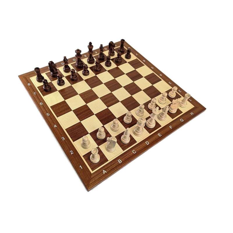 1. profesjonalną, klasyczną, pięknie wyglądającą drewnianą szachownicę wykonaną metodą intarsji w kolorze klasycznego mahoniu (S-9/c)