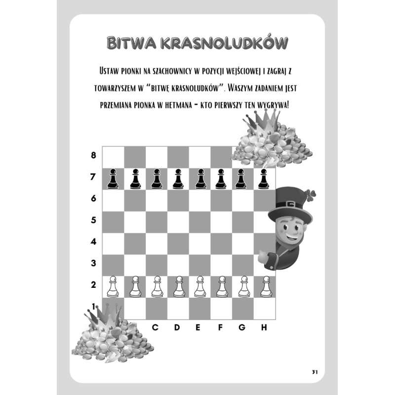Książka opiewa treścią pierwszy rok nauki gry w szachy od podstaw - przedstawia figury szachowe, szachownicę, podstawowe zasady, nazewnictwo: od pierwszego ruchu figurą do mata w 1 posunięciu. Wszystko to „okraszone” elementami zabawowymi i graficznymi.
