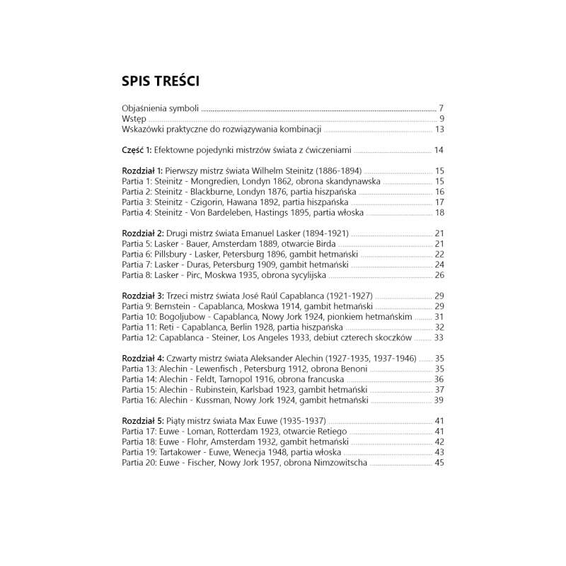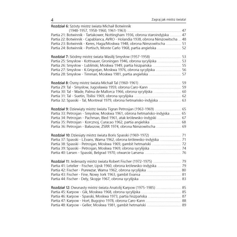 Niezwykle istotne jest zapoznanie się z dorobkiem twórczym mistrzów świata. Czego można się nauczyć od nich? Z całą pewnością bardzo wiele. Każdy z nich był bowiem najwybitniejszym graczem swoich czasów i na drodze do tytułu najsilniejszego zawodnika globu musiał pokonać elitę najlepszych z najlepszych oponentów w rozgrywkach eliminacyjnych i w końcu zwyciężyć w meczu finałowym! W tych trudnych i emocjonujących spotkaniach musiał wykorzystać wszystkie swoje umiejętności oraz wiedzę, aby rozłożyć na łopatki wielu znakomitych przeciwników!
