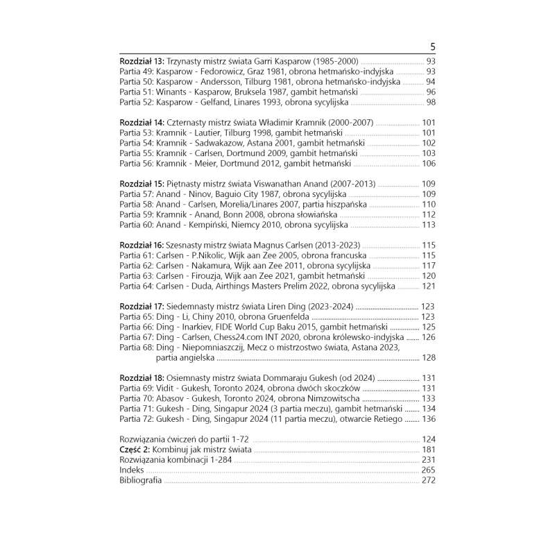 Na bazie 64 pouczających partii, rozegranych w okresie 1862-2022, przedstawiłem w ogólnych zarysach styl gry każdego czempiona w sferze walki taktycznej. Aby stworzyć więcej emocji w trakcie ich oglądania, w krytycznym momencie rozgrywka została przerwana i zadaniem Czytelnika jest prawidłowa ocena każdej powstałej sytuacji i następnie znalezienie drogi do wygranej. Jest to więc równoznaczne z odgadnięciem myśli mistrza świata. Przez to będzie możliwość nie tylko przetestowania swoich kombinacyjnych umiejętności, ale również – poprzez ocenę punktową – sprawdzenie aktualnej siły gry w zakresie taktyki szachowej. Swoje analizy można sprawdzić w rozwiązaniach ćwiczeń do partii 1-64.