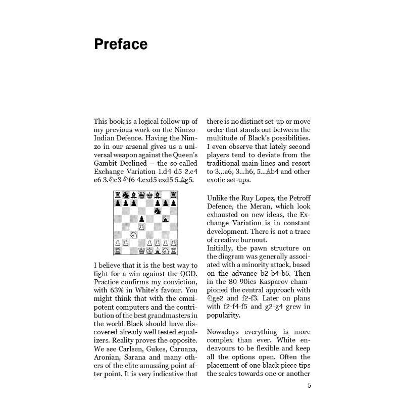 This book is a logical follow up of Semkov’s previous work on the Nimzo-Indian Defence. It covers the Exchange Variation 1.d4 d5 2.c4 e6 3.Nc3 Nf6 4.cxd5 exd5 5.Bg5 against the Queen’s Gambit Declined. Practical results of 63% in White’s favour and the endorcement of Carlsen, Gukes, Caruana, Aronian, Sarana and many others of the elite confirm the prominent status of this system.