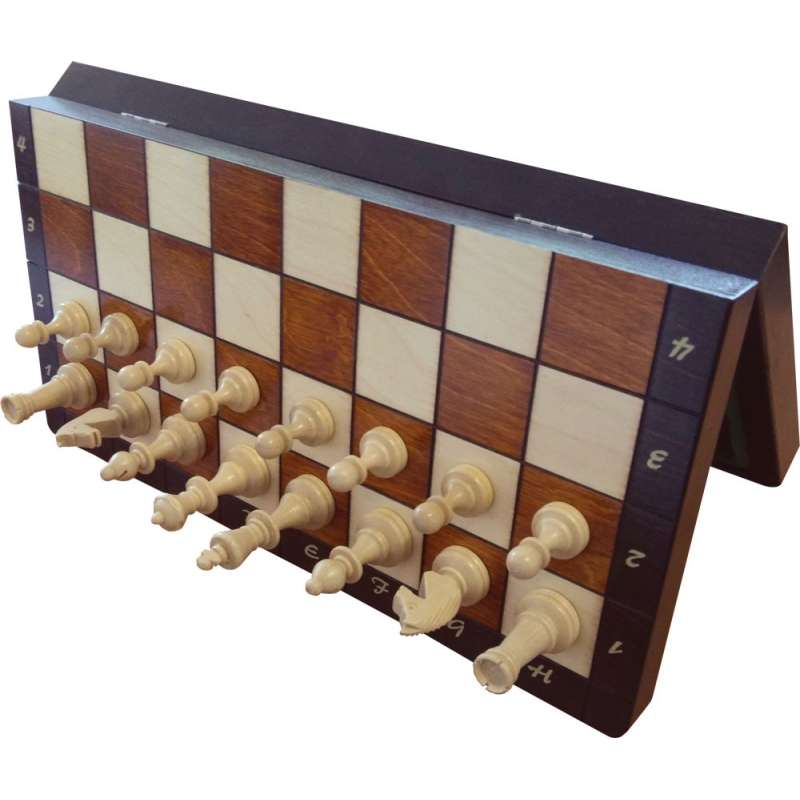 Drewniane szachy magnetyczne z intarsjowaną, składaną na pół szachownicą w kolorze mahoniu.