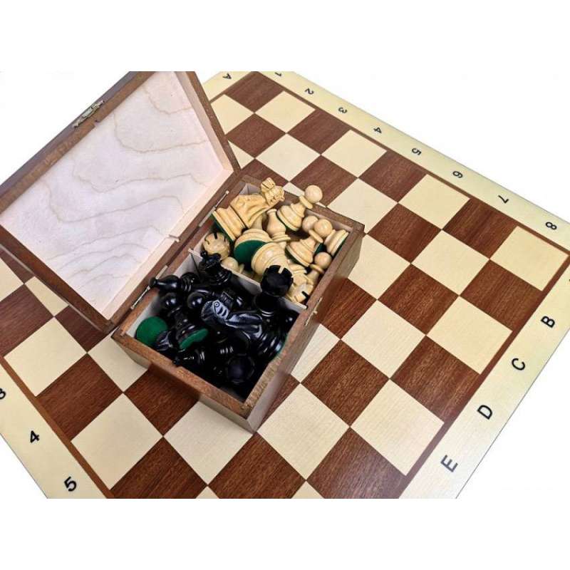 Drewniana deska wykonana metodą intarsji z rzadko spotykanymi jasnymi brzegami, która pięknie komponuje się z figurami tworząc wspaniały zestaw, który ucieszy oko każdego miłośnika królewskiej gry.