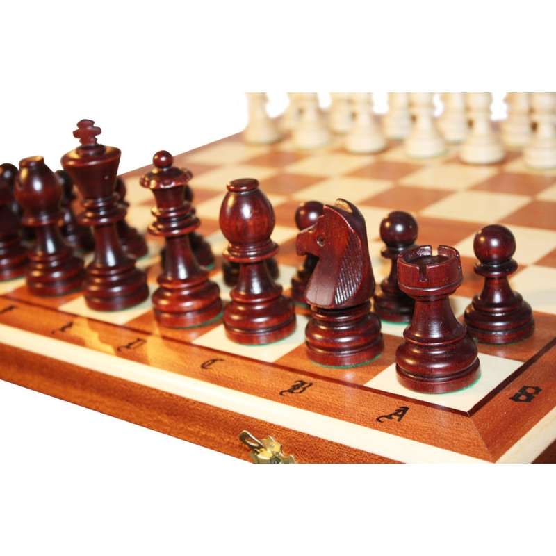 Szachy drewniane Staunton nr 7 składane na pół, wykonane są z drewna grabowego. Kaseta szachowa intarsjowana mahoniowo - jaworowa
