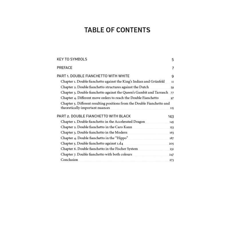The main part of the book is divided into exercises and solutions, with 110 positions taken from double fianchetto games. I have divided the exercises into chapters, with each chapter featuring games by players who have deployed the double fianchetto quite often. You will find a lot of typical motifs used by these players.