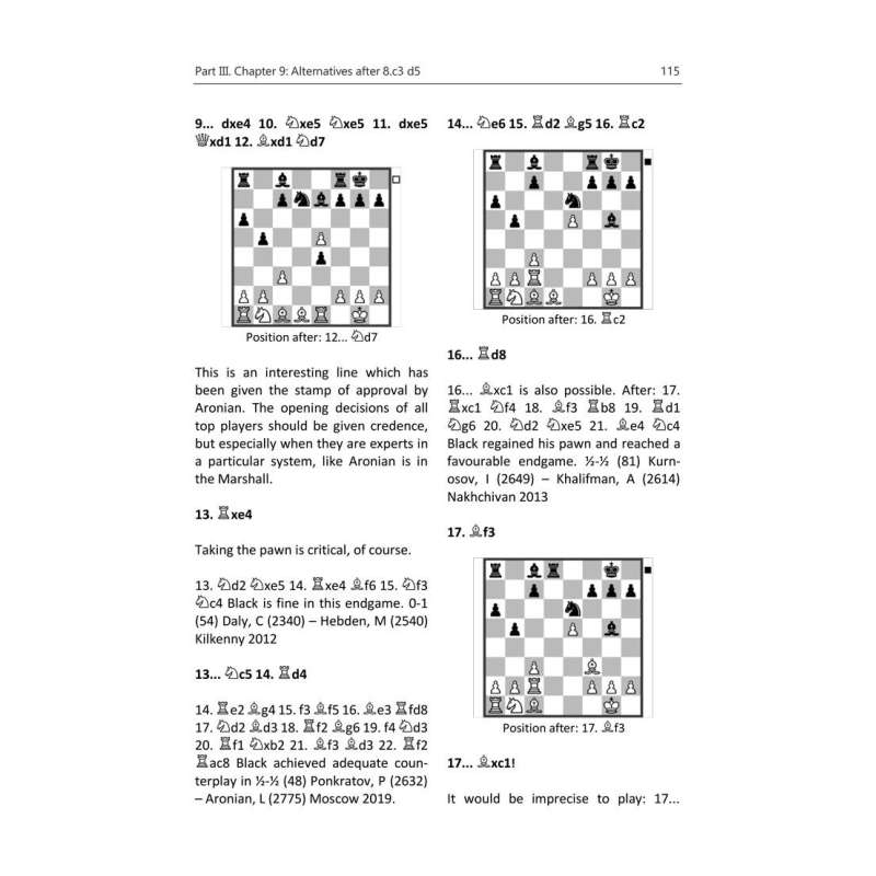 This book is about the Marshall Attack and the lines which can be grouped together under the banner of the so-called Anti-Marshall. The theory has developed so much in the last decade that there is more than enough material to be going on with just in those areas, but I also decided to include a detailed look at an important line in the Exchange Variation. Black’s key concept in the Marshall is giving up a central pawn in return for activity, and I have tried to give as many lines as possible which adhere closely to this principle. Why is this so significant? Well, for starters, usually in the Ruy Lopez Black is looking for long, slow games in solid, closed positions. The Marshall flips this on its head and Black tries to accelerate the play and radically change the character of the game at an early stage. Let’s briefly discuss the material of the book itself and the lines that I have decided to give. First of all, I started off with the standard Marshall Attack, after the initial moves: 1.e4 e5 2.Nf3 Nc6 3.Bb5 a6 4.Ba4 Nf6 5.0-0 Be7 6.Re1 b5 7.Bb3 0-0 8.c3 d5. I have given direct analysis wherever possible and I have tried to cover all the essential lines. Of course, with the passing of the years and he continual development of theory we can see how the popularity of some positions has shifted and, in some cases, how certain lines have simply been rendered obsolete. I also discovered, to my surprise, that there are still new, unexplored, and interesting paths for further analysis.